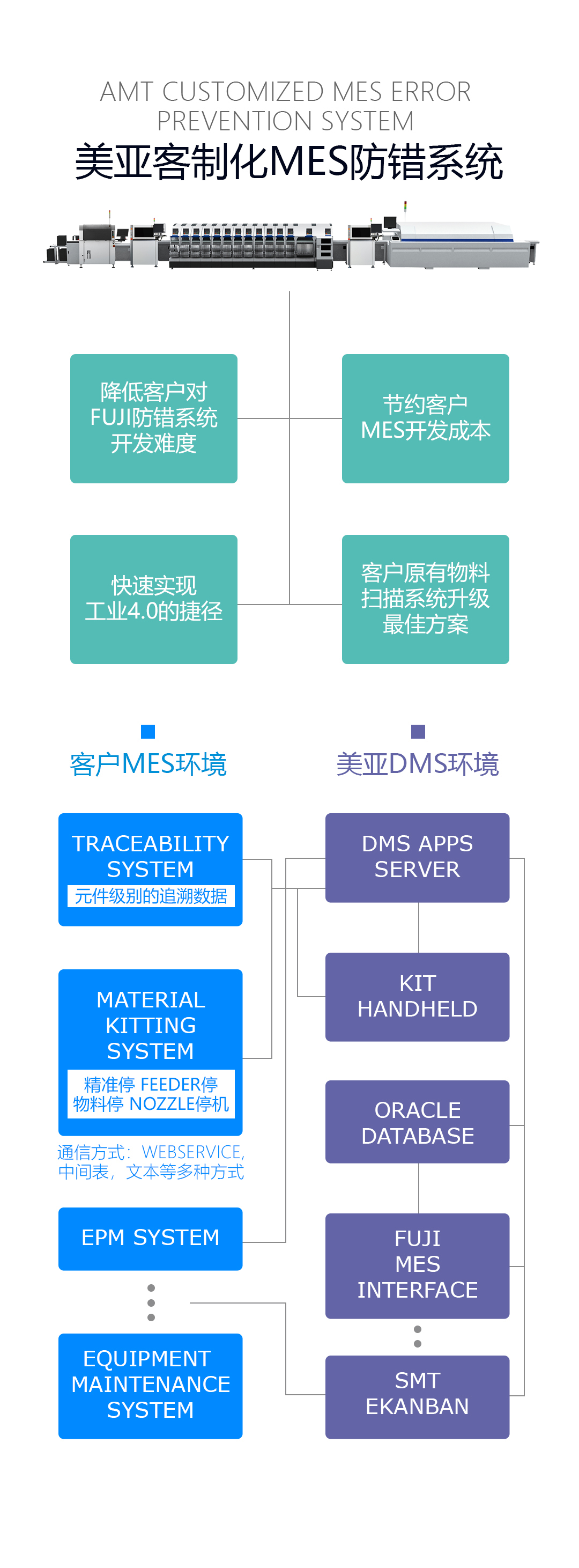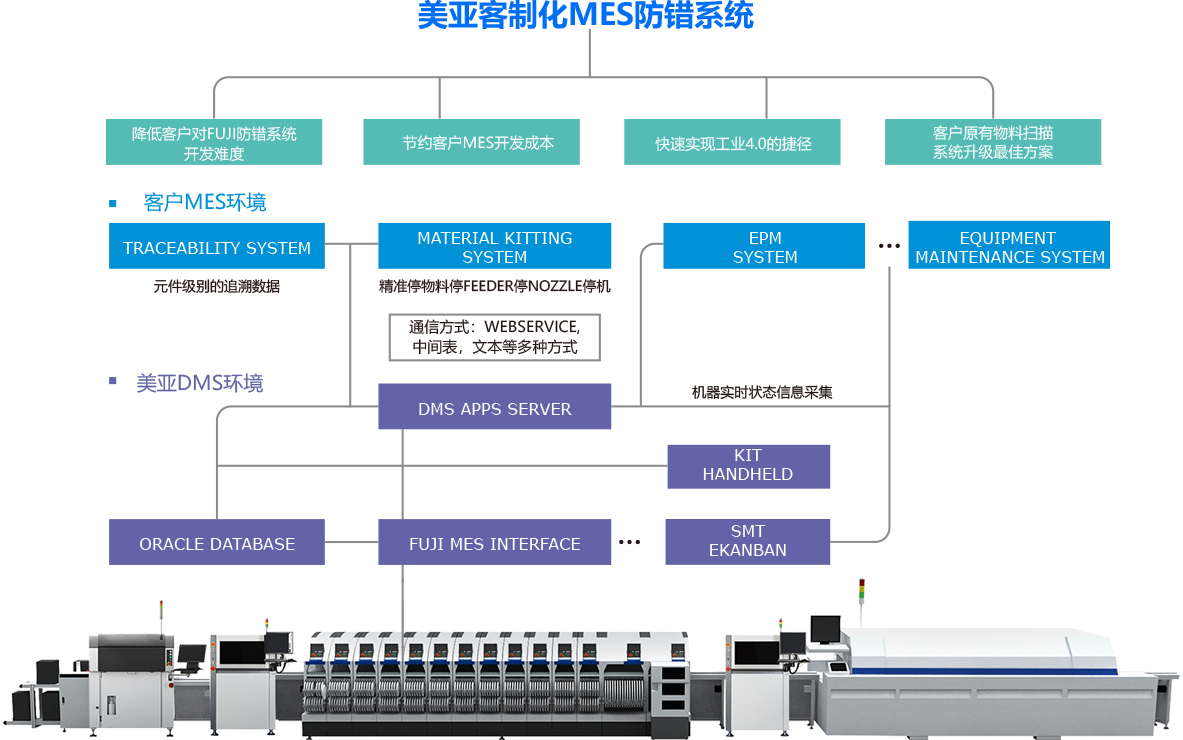 FUJI的機(jī)器很先進(jìn),它的接口開發(fā)需要開發(fā)者有很專業(yè)的FUJI設(shè)備經(jīng)驗(yàn),為加快客戶的工業(yè)4.0的實(shí)施進(jìn)度,美亞根據(jù)自己實(shí)力應(yīng)勢推出客制化MES防錯(cuò)系統(tǒng)。