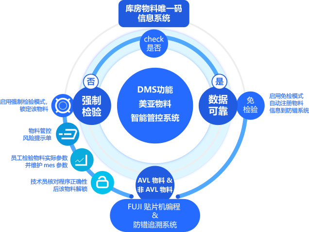 貼片機(jī)編程&物料掃描系統(tǒng)——基于MES的物料包裝信息自動(dòng)創(chuàng)建物料貼片信息。對于未check的物料先暫時(shí)禁用,待現(xiàn)場確認(rèn)核對其4個(gè)參數(shù)后,再依據(jù)MES維護(hù)后的物料信息自動(dòng)創(chuàng)建物料貼片信息并對該物料放行生產(chǎn)。
